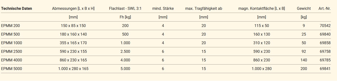 De EPMM elektropermanente hefmagneten worden gebruikt waar frequente handling van werkstukken plaatsvindt vanwege de zeer korte schakeltijd. Om deze apparaten te gebruiken, hoeven ze alleen maar te worden voorzien van netspanning, 230V of 400V afhankelijk van de magneet, en zijn dan direct klaar voor gebruik.