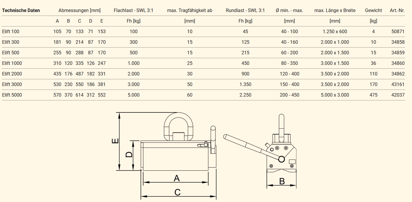 De onmiskenbare voordelen van de Elift hefmagneten van Assfalg zijn zuinigheid en snelle handling. De handbediende permanente hefmagneet is een perfecte en geavanceerde oplossing voor het rationeel, veilig en betrouwbaar verplaatsen van alle ferromagnetische materialen. Het gebruik bij het heffen en transporteren strekt zich uit tot een verscheidenheid aan vlakke en ronde werkstukken, van voorbewerkte materialen tot ruwe materialen. Er is een breed scala aan types Elift hefmagneten beschikbaar met draagvermogens tussen 100 kg en 5000 kg voor verschillende materiaaldiktes. De Elift is een onvervangbare helper geworden in vele toepassingsgebieden. ASSFALG biedt ook een extra ringoog voor de Elift 300 en Elift 500, waarmee verticaal transport mogelijk is.